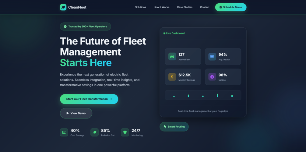 Benefit: Engages visitors by showing quantifiable benefits of your fleet solutions, increasing conversion potential. - 💼 Rich Content Sections: Hero area, solution cards with gradient icons, process steps, success stories, lead generation forms, and demo call-to-action